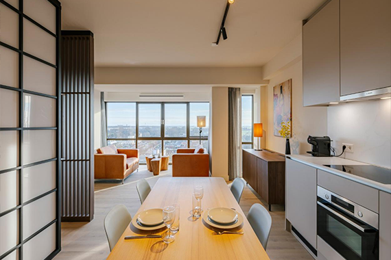 Modern serviced apartments offering home-like comfort with hotel-level amenities. Each apartment is fully furnished and includes a comfortable living area, a fully equipped kitchen, and ensuite bathroom(s). Guests also enjoy access to a variety of on-site amenities such as a gym, swimming pool, sauna, and complimentary Wi-Fi.